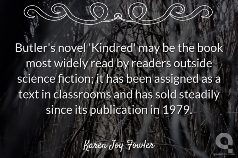 Butler's novel 'Kindred' may be the book most widely read by readers outside science fiction; it has been assigned as a text in classrooms and has sold steadily since its publication in 1979. Karen Joy Fowler