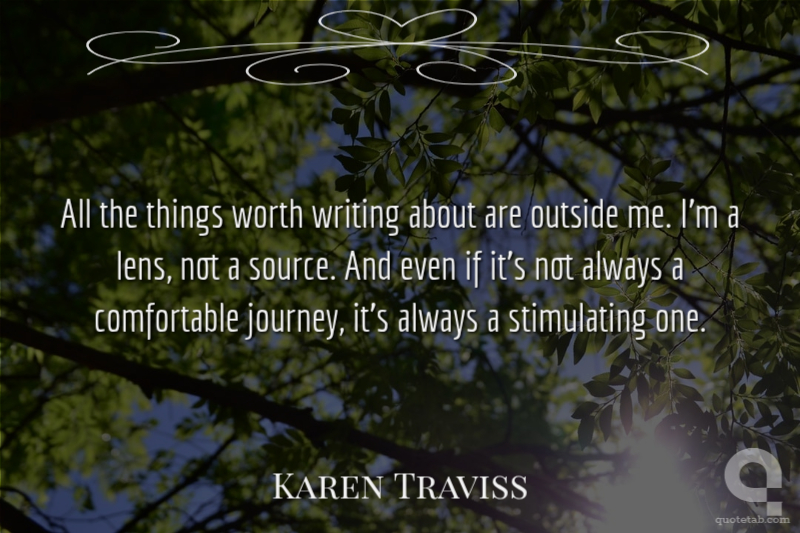 All the things worth writing about are outside me. I'm a lens, not a source. And even if it's not always a comfortable journey, it's always a stimulating one. Karen Traviss