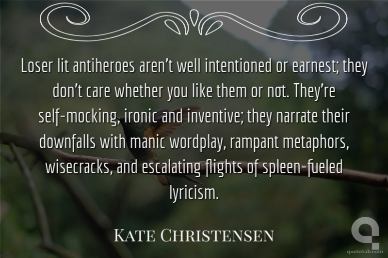Loser lit antiheroes aren't well intentioned or earnest; they don't care whether you like them or not. They're self-mocking, ironic and inventive; they narrate their downfalls with manic wordplay, rampant metaphors, wisecracks, and escalating flights of spleen-fueled lyricism. Kate Christensen