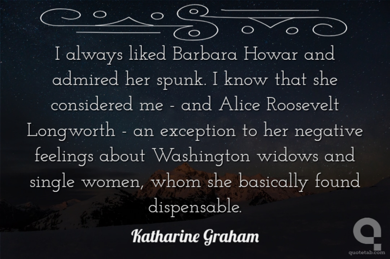 I always liked Barbara Howar and admired her spunk. I know that she considered me - and Alice Roosevelt Longworth - an exception to her negative feelings about Washington widows and single women, whom she basically found dispensable. Katharine Graham