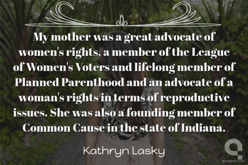 My mother was a great advocate of women's rights, a member of the League of Women's Voters and lifelong member of Planned Parenthood and an advocate of a woman's rights in terms of reproductive issues. She was also a founding member of Common Cause in the state of Indiana. Kathryn Lasky