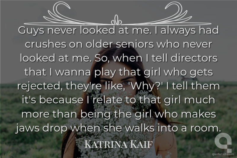 Guys never looked at me. I always had crushes on older seniors who never looked at me. So, when I tell directors that I wanna play that girl who gets rejected, they're like, 'Why?' I tell them it's because I relate to that girl much more than being the girl who makes jaws drop when she walks into a room. Katrina Kaif