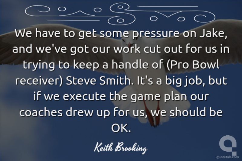 We have to get some pressure on Jake, and we've got our work cut out for us in trying to keep a handle of (Pro Bowl receiver) Steve Smith. It's a big job, but if we execute the game plan our coaches drew up for us, we should be OK. Keith Brooking