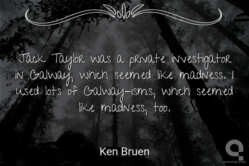 Jack Taylor was a private investigator in Galway, which seemed like madness. I used lots of Galway-isms, which seemed like madness, too. Ken Bruen