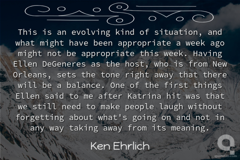 This is an evolving kind of situation, and what might have been appropriate a week ago might not be appropriate this week. Having Ellen DeGeneres as the host, who is from New Orleans, sets the tone right away that there will be a balance. One of the first things Ellen said to me after Katrina hit was that we still need to make people laugh without forgetting about what's going on and not in any way taking away from its meaning. Ken Ehrlich