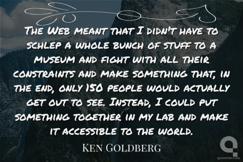 The Web meant that I didn't have to schlep a whole bunch of stuff to a museum and fight with all their constraints and make something that, in the end, only 150 people would actually get out to see. Instead, I could put something together in my lab and make it accessible to the world. Ken Goldberg