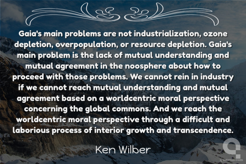 Gaia's main problems are not industrialization, ozone depletion, overpopulation, or resource depletion. Gaia's main problem is the lack of mutual understanding and mutual agreement in the noosphere about how to proceed with those problems. We cannot rein in industry if we cannot reach mutual understanding and mutual agreement based on a worldcentric moral perspective concerning the global commons. And we reach the worldcentric moral perspective through a difficult and laborious process of interior growth and transcendence. Ken Wilber