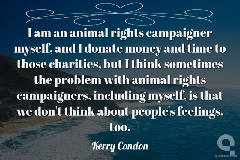 I am an animal rights campaigner myself, and I donate money and time to those charities, but I think sometimes the problem with animal rights campaigners, including myself, is that we don't think about people's feelings, too. Kerry Condon