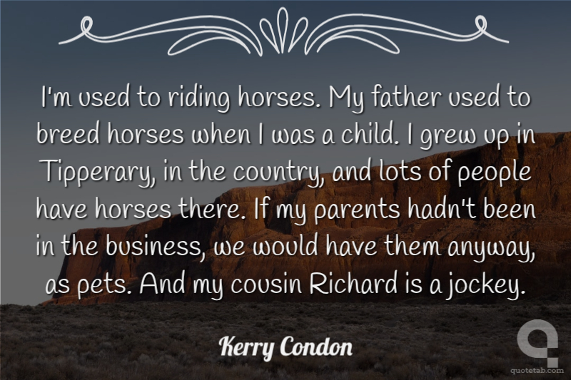 I'm used to riding horses. My father used to breed horses when I was a child. I grew up in Tipperary, in the country, and lots of people have horses there. If my parents hadn't been in the business, we would have them anyway, as pets. And my cousin Richard is a jockey. Kerry Condon