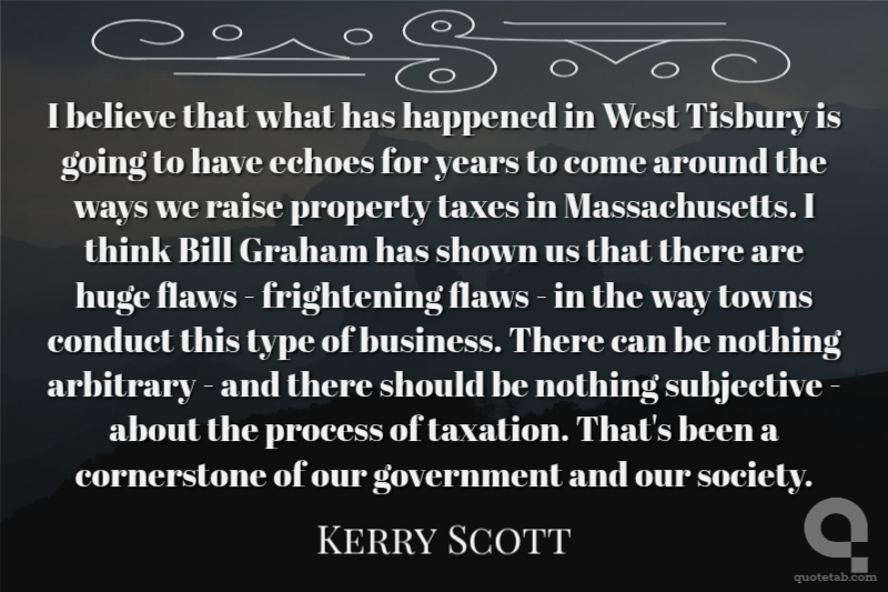 I believe that what has happened in West Tisbury is going to have echoes for years to come around the ways we raise property taxes in Massachusetts. I think Bill Graham has shown us that there are huge flaws - frightening flaws - in the way towns conduct this type of business. There can be nothing arbitrary - and there should be nothing subjective - about the process of taxation. That's been a cornerstone of our government and our society. Kerry Scott