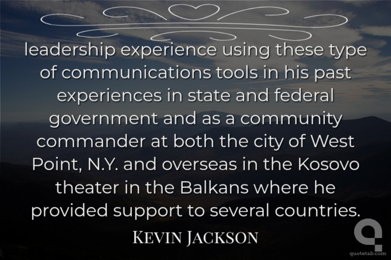 leadership experience using these type of communications tools in his past experiences in state and federal government and as a community commander at both the city of West Point, N.Y. and overseas in the Kosovo theater in the Balkans where he provided support to several countries. Kevin Jackson