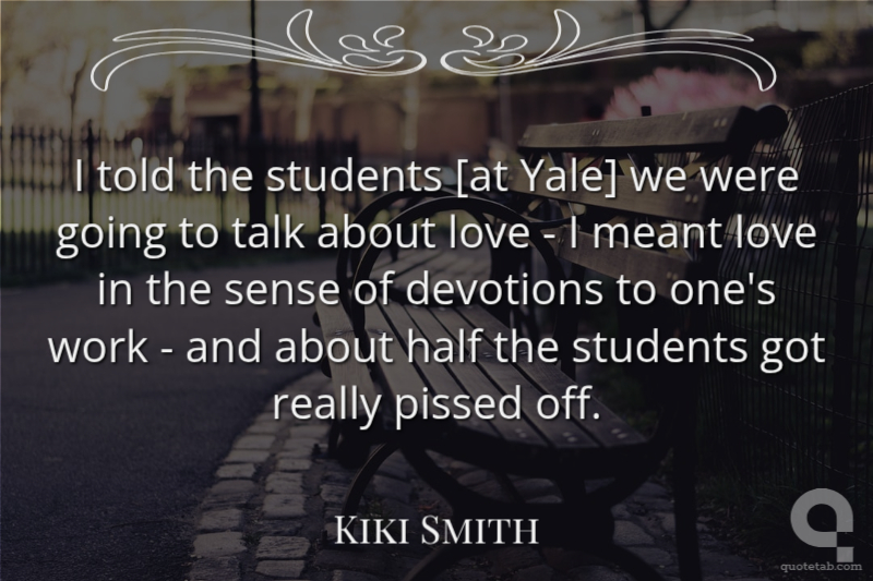 I told the students [at Yale] we were going to talk about love - I meant love in the sense of devotions to one's work - and about half the students got really pissed off. Kiki Smith