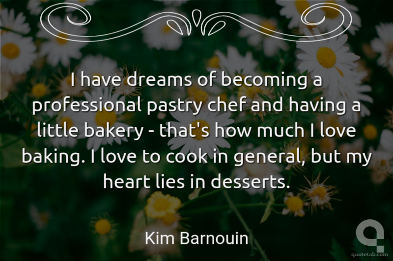 I have dreams of becoming a professional pastry chef and having a little bakery - that's how much I love baking. I love to cook in general, but my heart lies in desserts. Kim Barnouin