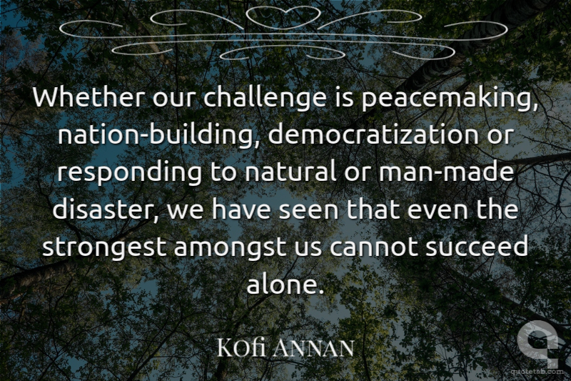 Whether our challenge is peacemaking, nation-building, democratization or responding to natural or man-made disaster, we have seen that even the strongest amongst us cannot succeed alone. Kofi Annan