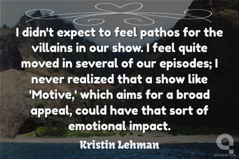 I didn't expect to feel pathos for the villains in our show. I feel quite moved in several of our episodes; I never realized that a show like 'Motive,' which aims for a broad appeal, could have that sort of emotional impact. Kristin Lehman
