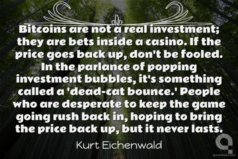 Bitcoins are not a real investment; they are bets inside a casino. If the price goes back up, don't be fooled. In the parlance of popping investment bubbles, it's something called a 'dead-cat bounce.' People who are desperate to keep the game going rush back in, hoping to bring the price back up, but it never lasts. Kurt Eichenwald