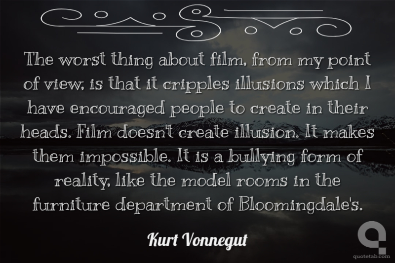 The worst thing about film, from my point of view, is that it cripples illusions which I have encouraged people to create in their heads. Film doesn't create illusion. It makes them impossible. It is a bullying form of reality, like the model rooms in the furniture department of Bloomingdale's. Kurt Vonnegut