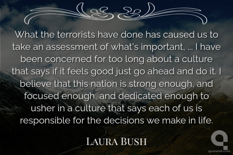 What the terrorists have done has caused us to take an assessment of what's important, ... I have been concerned for too long about a culture that says if it feels good just go ahead and do it. I believe that this nation is strong enough, and focused enough, and dedicated enough to usher in a culture that says each of us is responsible for the decisions we make in life. Laura Bush