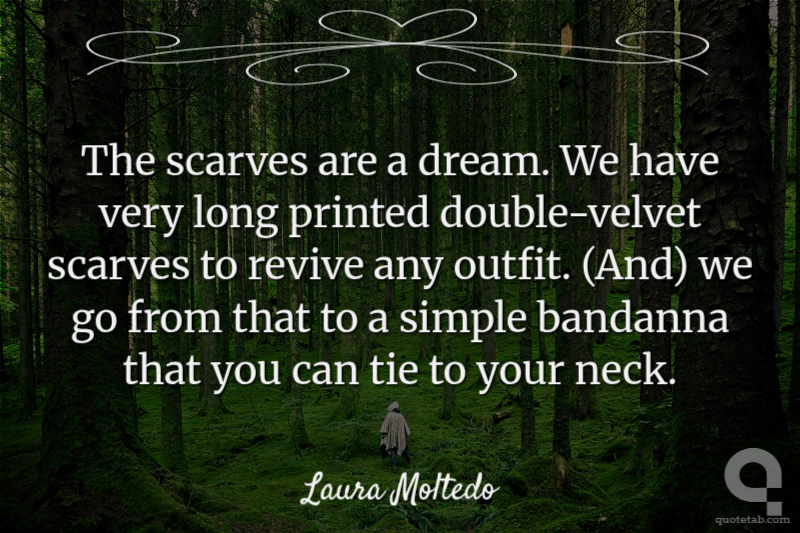 The scarves are a dream. We have very long printed double-velvet scarves to revive any outfit. (And) we go from that to a simple bandanna that you can tie to your neck. Laura Moltedo
