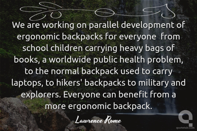 We are working on parallel development of ergonomic backpacks for everyone from school children carrying heavy bags of books, a worldwide public health problem, to the normal backpack used to carry laptops, to hikers' backpacks to military and explorers. Everyone can benefit from a more ergonomic backpack. Lawrence Rome