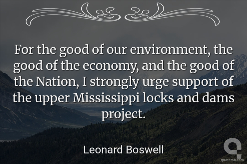 For the good of our environment, the good of the economy, and the good of the Nation, I strongly urge support of the upper Mississippi locks and dams project. Leonard Boswell