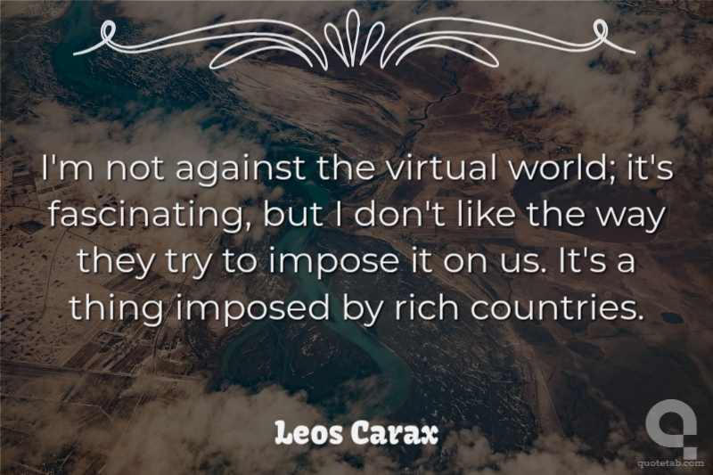 I'm not against the virtual world; it's fascinating, but I don't like the way they try to impose it on us. It's a thing imposed by rich countries. Leos Carax