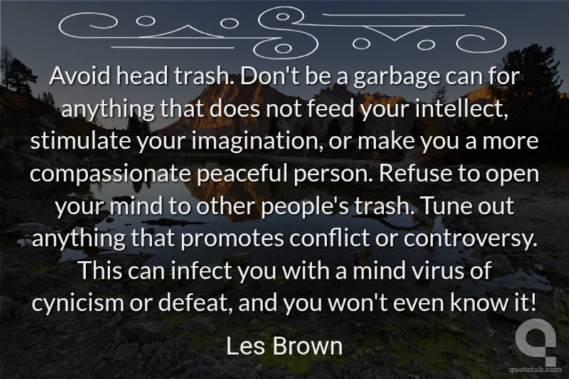 Avoid head trash. Don't be a garbage can for anything that does not feed your intellect, stimulate your imagination, or make you a more compassionate peaceful person. Refuse to open your mind to other people's trash. Tune out anything that promotes conflict or controversy. This can infect you with a mind virus of cynicism or defeat, and you won't even know it! Les Brown