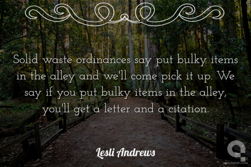 Solid waste ordinances say put bulky items in the alley and we'll come pick it up. We say if you put bulky items in the alley, you'll get a letter and a citation. Lesli Andrews