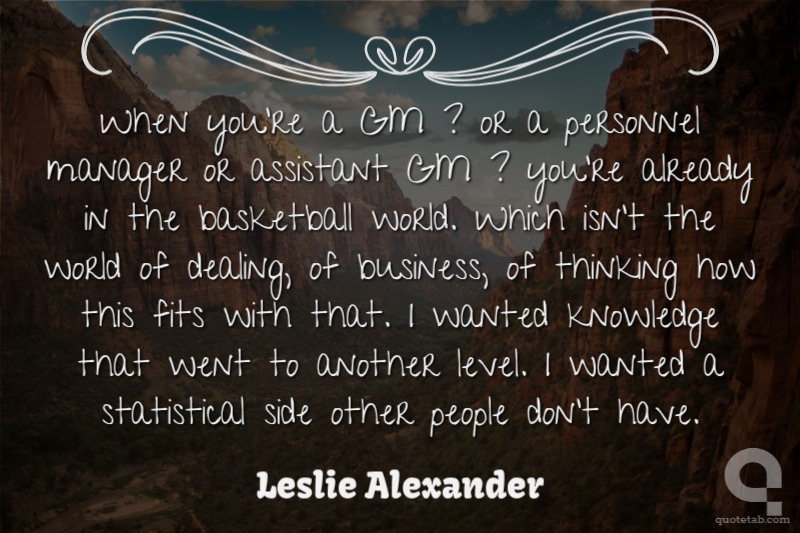 When you're a GM ? or a personnel manager or assistant GM ? you're already in the basketball world. Which isn't the world of dealing, of business, of thinking how this fits with that. I wanted knowledge that went to another level. I wanted a statistical side other people don't have. Leslie Alexander