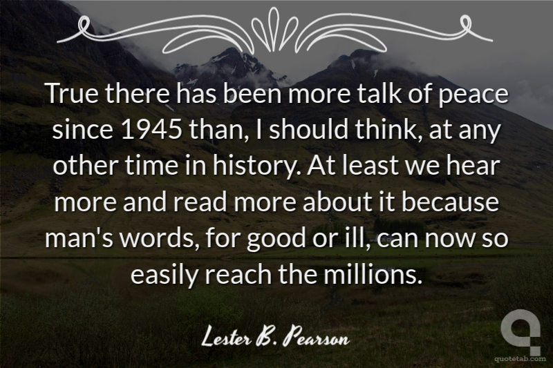 True there has been more talk of peace since 1945 than, I should think, at any other time in history. At least we hear more and read more about it because man's words, for good or ill, can now so easily reach the millions. Lester B. Pearson