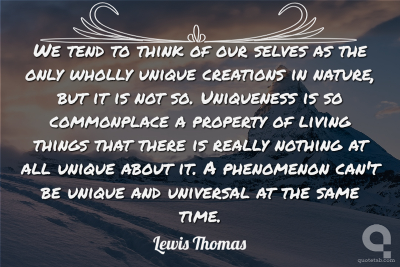 We tend to think of our selves as the only wholly unique creations in nature, but it is not so. Uniqueness is so commonplace a property of living things that there is really nothing at all unique about it. A phenomenon can't be unique and universal at the same time. Lewis Thomas