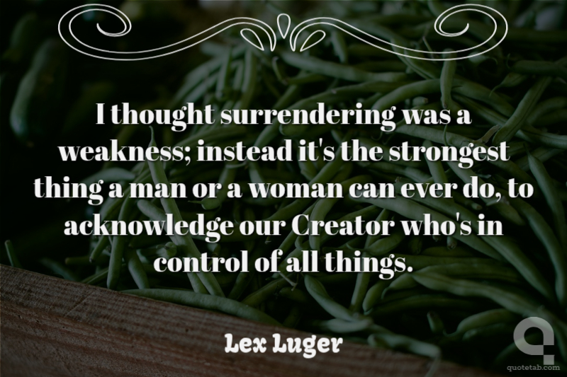 I thought surrendering was a weakness; instead it's the strongest thing a man or a woman can ever do, to acknowledge our Creator who's in control of all things. Lex Luger