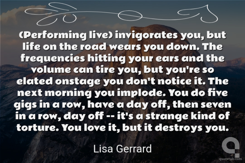 (Performing live) invigorates you, but life on the road wears you down. The frequencies hitting your ears and the volume can tire you, but you're so elated onstage you don't notice it. The next morning you implode. You do five gigs in a row, have a day off, then seven in a row, day off -- it's a strange kind of torture. You love it, but it destroys you. Lisa Gerrard