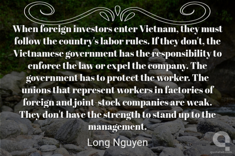 When foreign investors enter Vietnam, they must follow the country's labor rules. If they don't, the Vietnamese government has the responsibility to enforce the law or expel the company. The government has to protect the worker. The unions that represent workers in factories of foreign and joint-stock companies are weak. They don't have the strength to stand up to the management. Long Nguyen