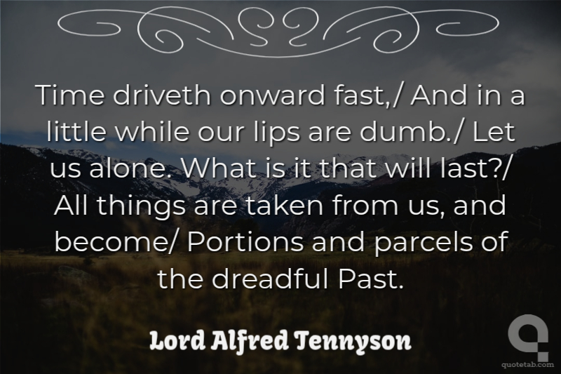 Time driveth onward fast,/ And in a little while our lips are dumb./ Let us alone. What is it that will last?/ All things are taken from us, and become/ Portions and parcels of the dreadful Past. Lord Alfred Tennyson