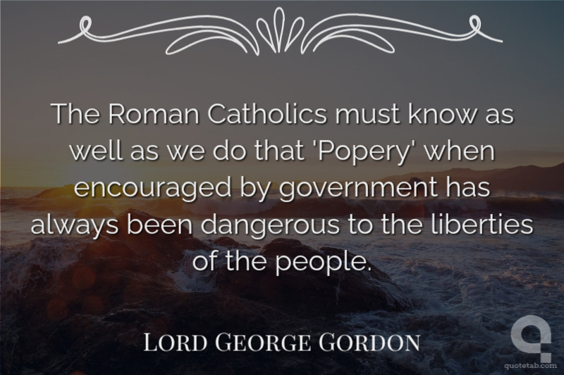 The Roman Catholics must know as well as we do that 'Popery' when encouraged by government has always been dangerous to the liberties of the people. Lord George Gordon