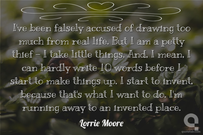 I've been falsely accused of drawing too much from real life. But I am a petty thief - I take little things. And, I mean, I can hardly write 10 words before I start to make things up. I start to invent, because that's what I want to do. I'm running away to an invented place. Lorrie Moore