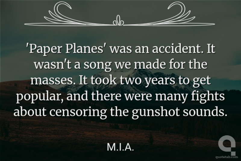 'Paper Planes' was an accident. It wasn't a song we made for the masses. It took two years to get popular, and there were many fights about censoring the gunshot sounds. M.I.A.