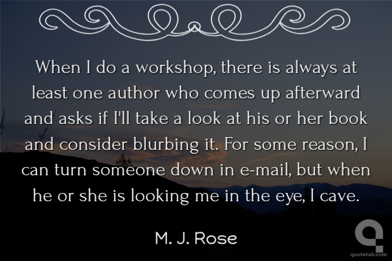 When I do a workshop, there is always at least one author who comes up afterward and asks if I'll take a look at his or her book and consider blurbing it. For some reason, I can turn someone down in e-mail, but when he or she is looking me in the eye, I cave. M. J. Rose