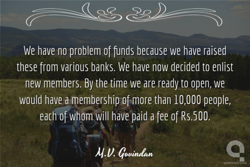 We have no problem of funds because we have raised these from various banks. We have now decided to enlist new members. By the time we are ready to open, we would have a membership of more than 10,000 people, each of whom will have paid a fee of Rs.500. M.V. Govindan