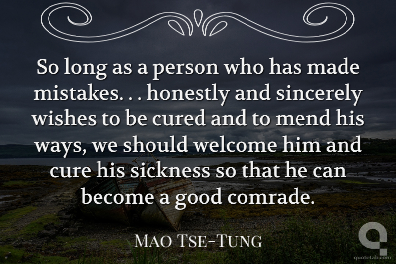 So long as a person who has made mistakes. . . honestly and sincerely wishes to be cured and to mend his ways, we should welcome him and cure his sickness so that he can become a good comrade. Mao Tse-Tung