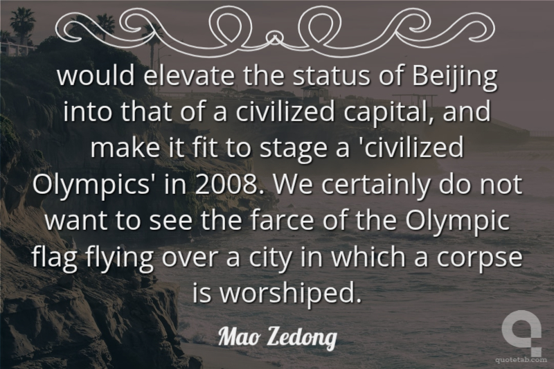 would elevate the status of Beijing into that of a civilized capital, and make it fit to stage a 'civilized Olympics' in 2008. We certainly do not want to see the farce of the Olympic flag flying over a city in which a corpse is worshiped. Mao Zedong