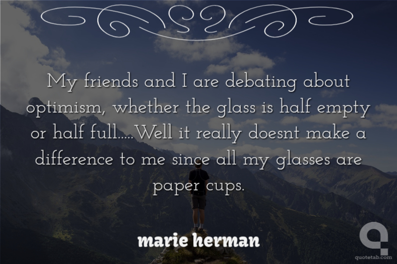 My friends and I are debating about optimism, whether the glass is half empty or half full.....Well it really doesnt make a difference to me since all my glasses are paper cups. marie herman