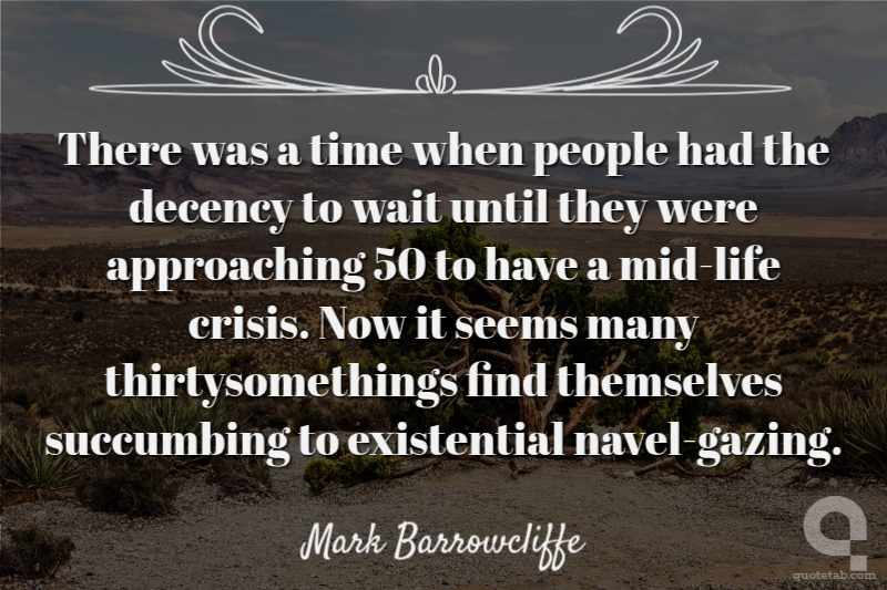 There was a time when people had the decency to wait until they were approaching 50 to have a mid-life crisis. Now it seems many thirtysomethings find themselves succumbing to existential navel-gazing. Mark Barrowcliffe
