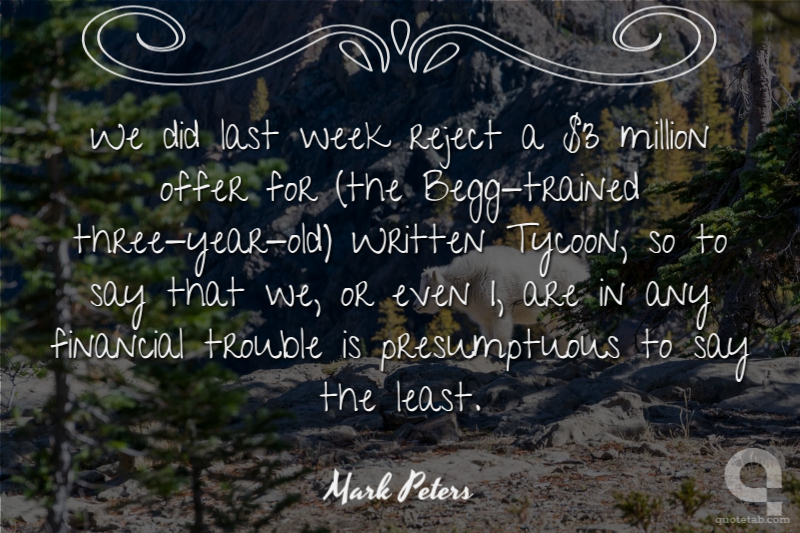 We did last week reject a $3 million offer for (the Begg-trained three-year-old) Written Tycoon, so to say that we, or even I, are in any financial trouble is presumptuous to say the least. Mark Peters