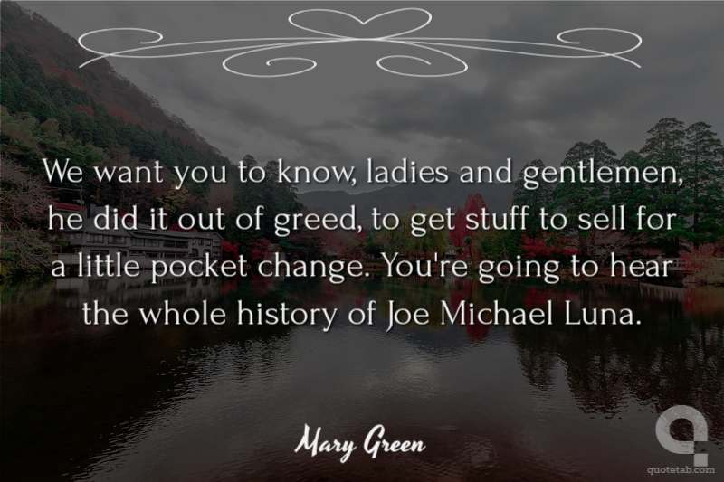 We want you to know, ladies and gentlemen, he did it out of greed, to get stuff to sell for a little pocket change. You're going to hear the whole history of Joe Michael Luna. Mary Green