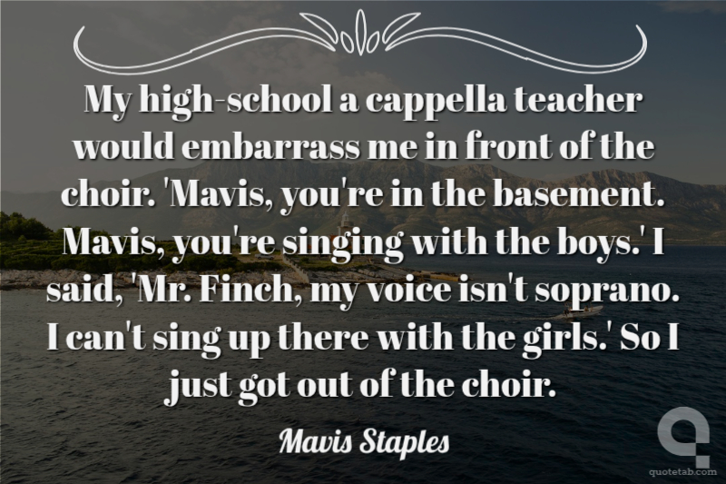 My high-school a cappella teacher would embarrass me in front of the choir. 'Mavis, you're in the basement. Mavis, you're singing with the boys.' I said, 'Mr. Finch, my voice isn't soprano. I can't sing up there with the girls.' So I just got out of the choir. Mavis Staples