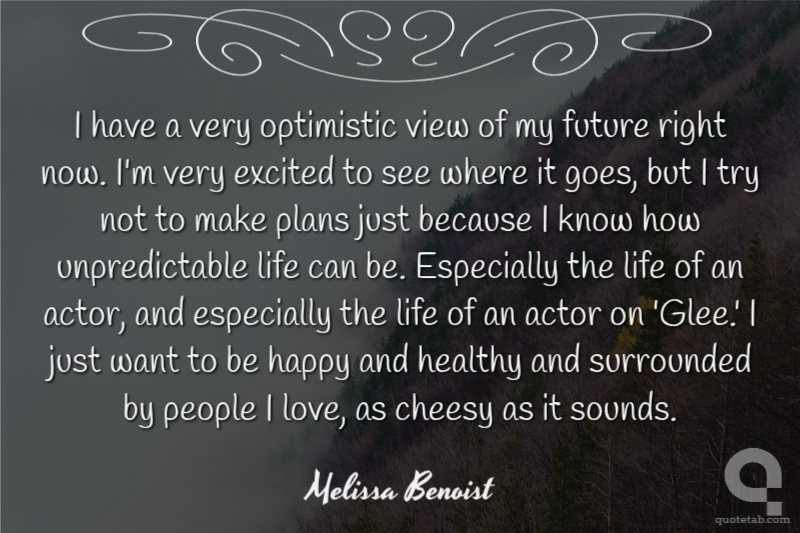 I have a very optimistic view of my future right now. I'm very excited to see where it goes, but I try not to make plans just because I know how unpredictable life can be. Especially the life of an actor, and especially the life of an actor on 'Glee.' I just want to be happy and healthy and surrounded by people I love, as cheesy as it sounds. Melissa Benoist