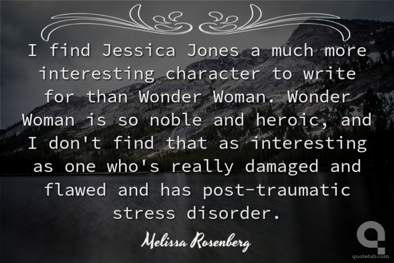 I find Jessica Jones a much more interesting character to write for than Wonder Woman. Wonder Woman is so noble and heroic, and I don't find that as interesting as one who's really damaged and flawed and has post-traumatic stress disorder. Melissa Rosenberg
