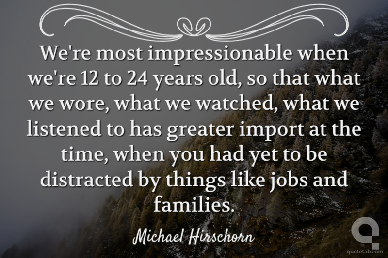 We're most impressionable when we're 12 to 24 years old, so that what we wore, what we watched, what we listened to has greater import at the time, when you had yet to be distracted by things like jobs and families. Michael Hirschorn